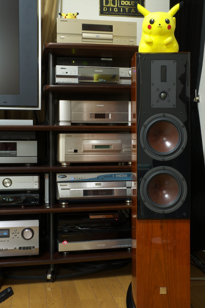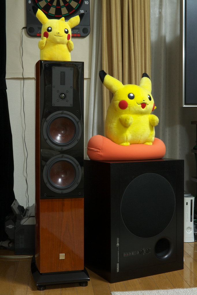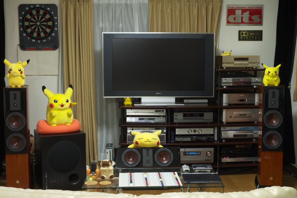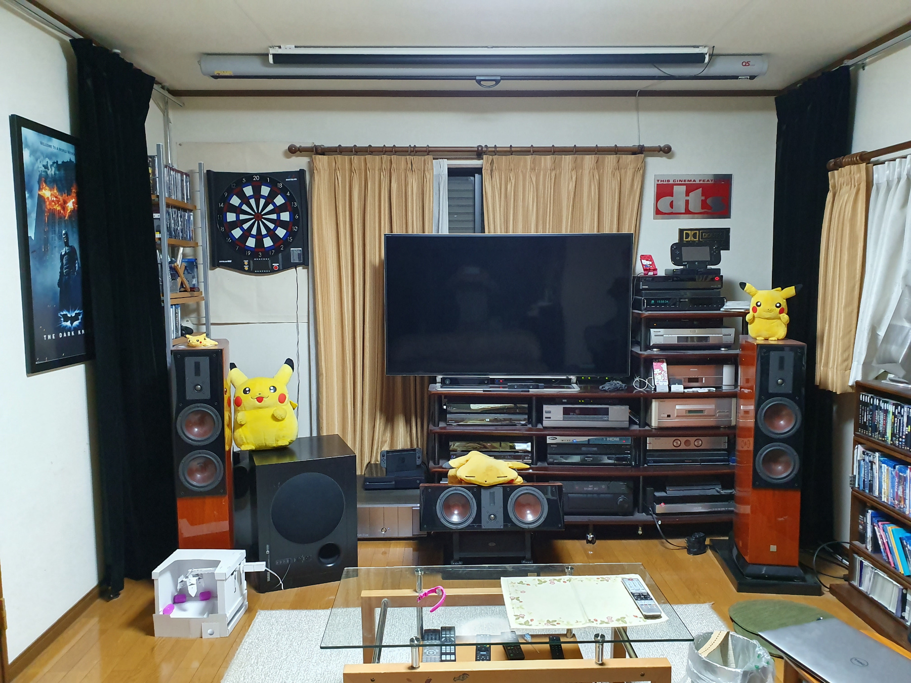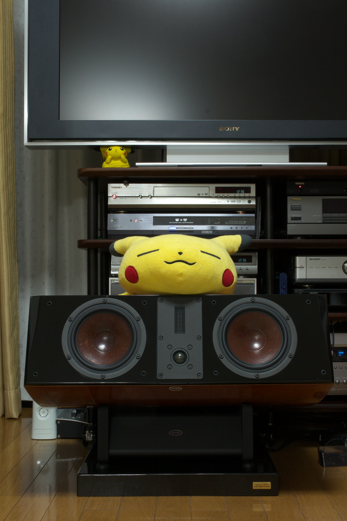 センタースピーカーの下には 石匠運慶のオーディオボードを引いてます。 他のスピーカーはスパイク受けで設置し、ウーファーの下は厚さ1mm程度のブチルゴムを引いてます。