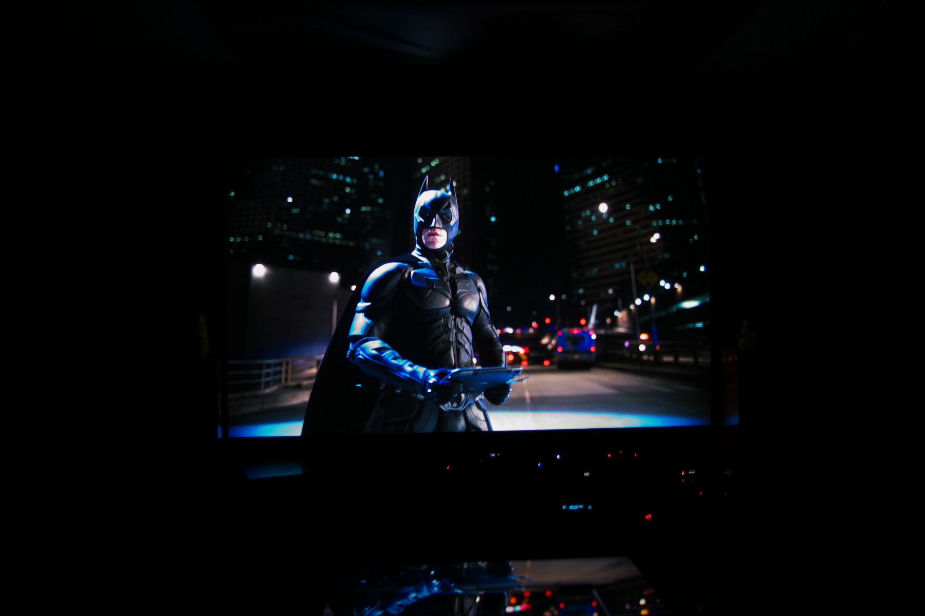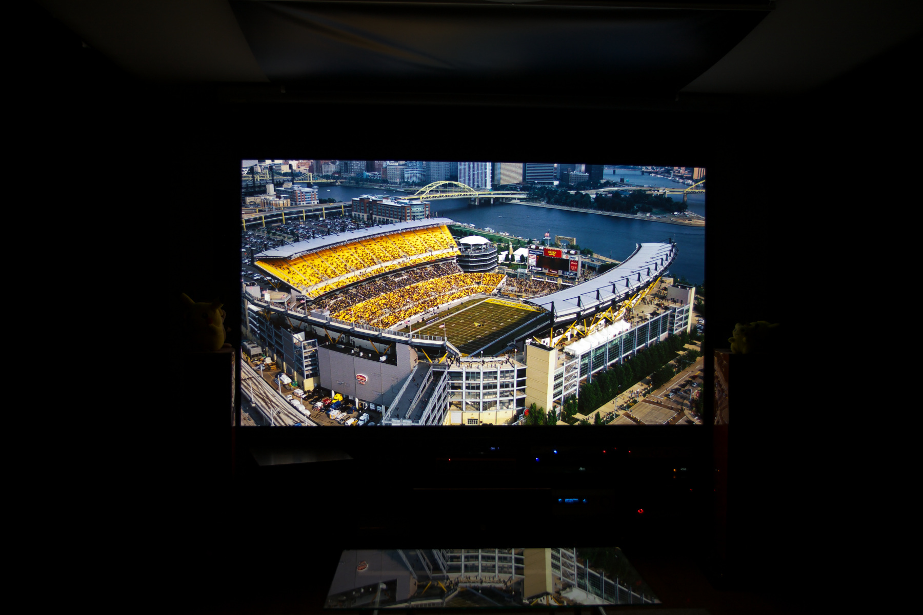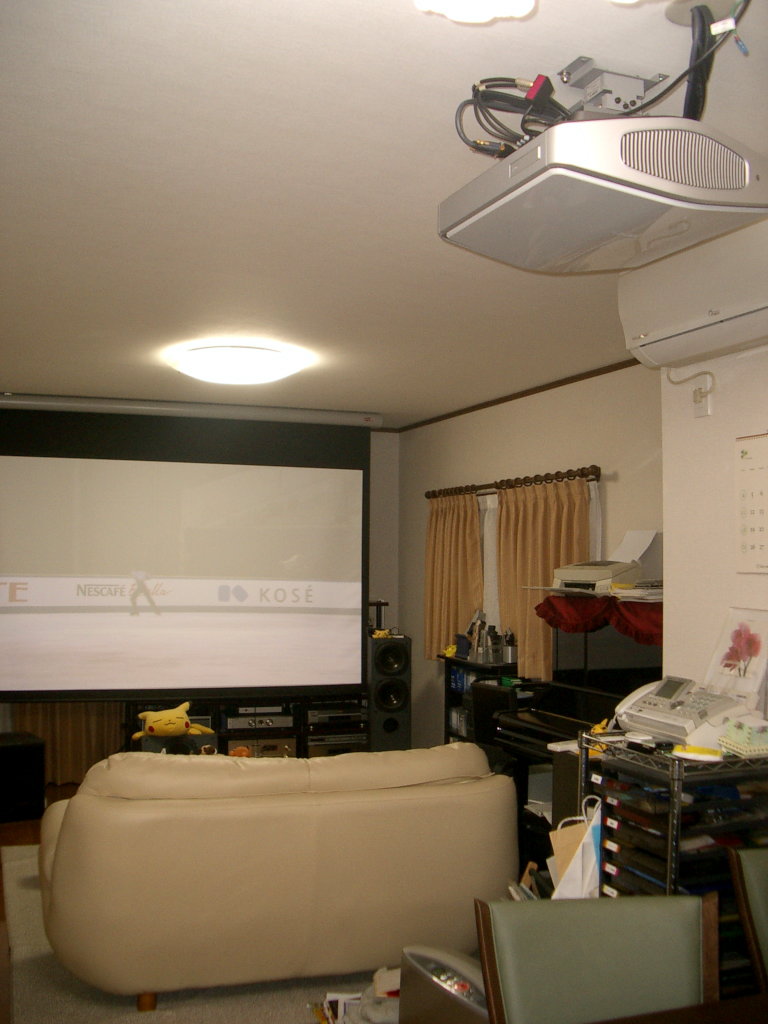 スクリーンに映像を写したところです。 暗幕で側面の迷光対策は出来てますが、天井には迷光が結構あります。 天井はさすがに対策のしようがない。