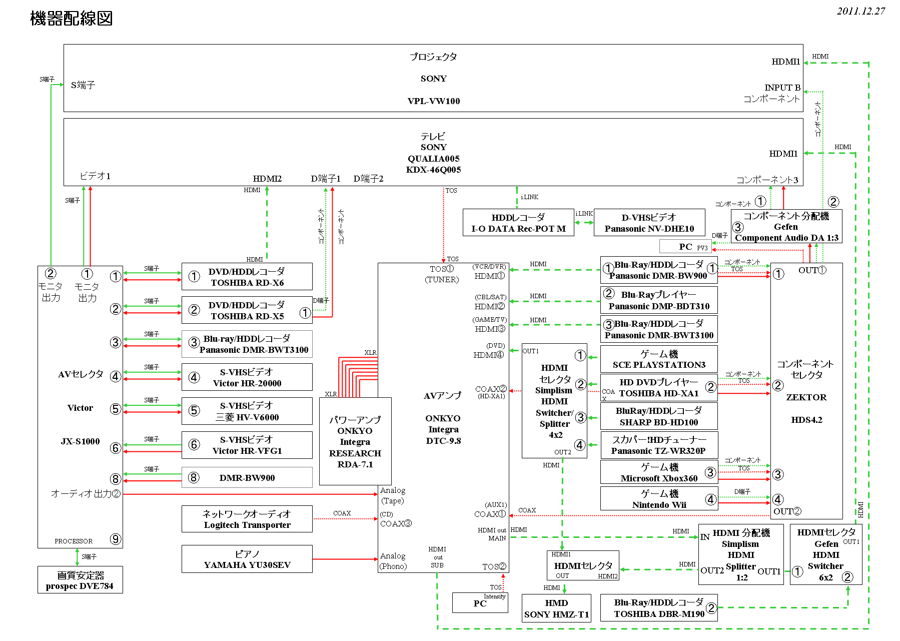 BD-HD100(HDMI出力) ↓ HDMI 1mケービルv Gefen HDMI Switcher 6x2 ↓ MonsterCable M1000HDMI DVI M-A(DVI-HDMI変換コネクタ) ↓ MonsterCable M500DVI-12M(12m DVIケーブル) ↓ AudioQuest DVI/HDMI ADAPTER(DVI-HDMI変換コネクタ) ↓ VPL-VW100(HDMI入力)という経路になっています。2つ変換コネクタを使っているので気持ち悪いですが、問題なく使えています。