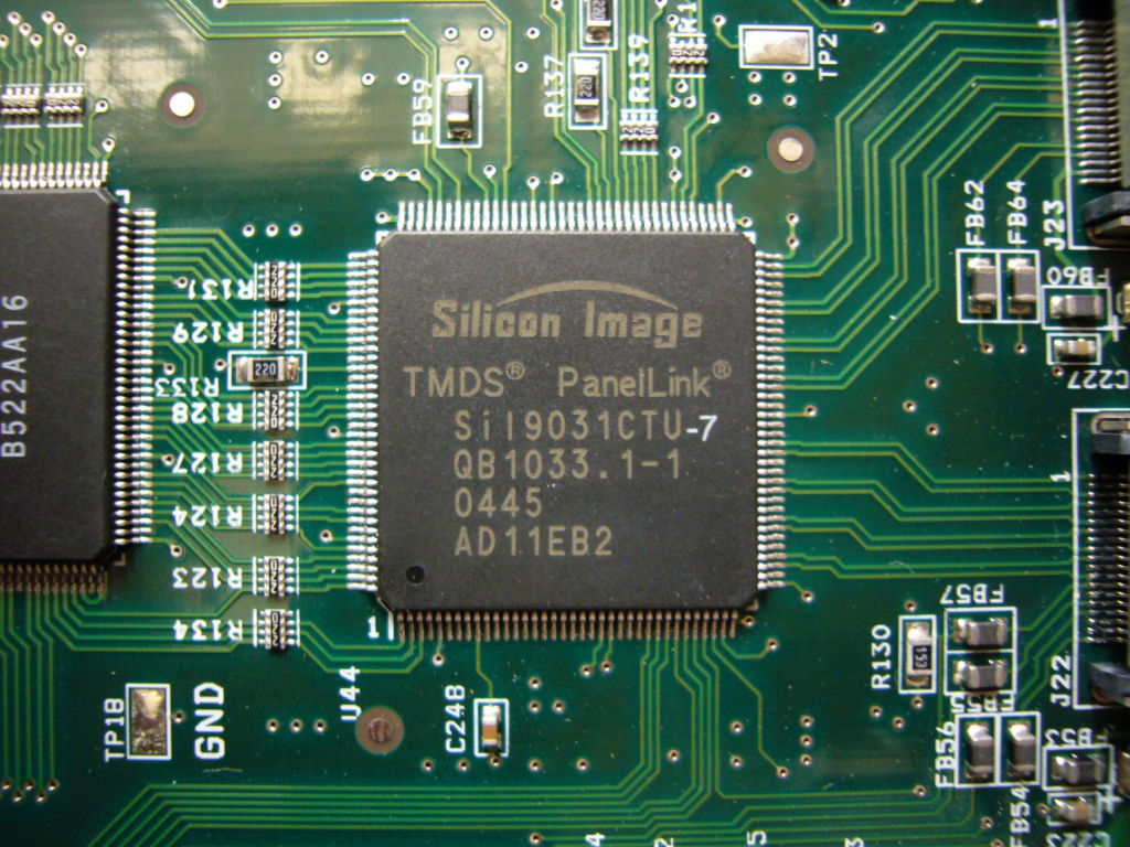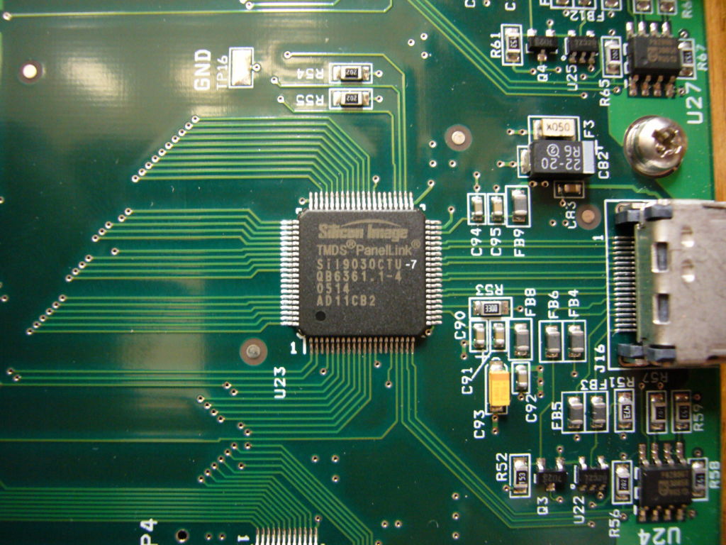 中は結構、詰まってる。 「Sil9031CTU-7」は「Dual input HDMI Receiver w/6/8 - channel audio (480p/720p/1080/1080p) 」、 「Sil9030CTU-7」は「HDMI Transmitter w/6/8-channel audio - PB free」らしい。 入力にDualを3つ、出力にsingleを2つということは、ちゃんと入出力の数だけのチップを付けているのね。