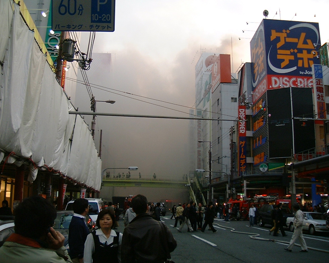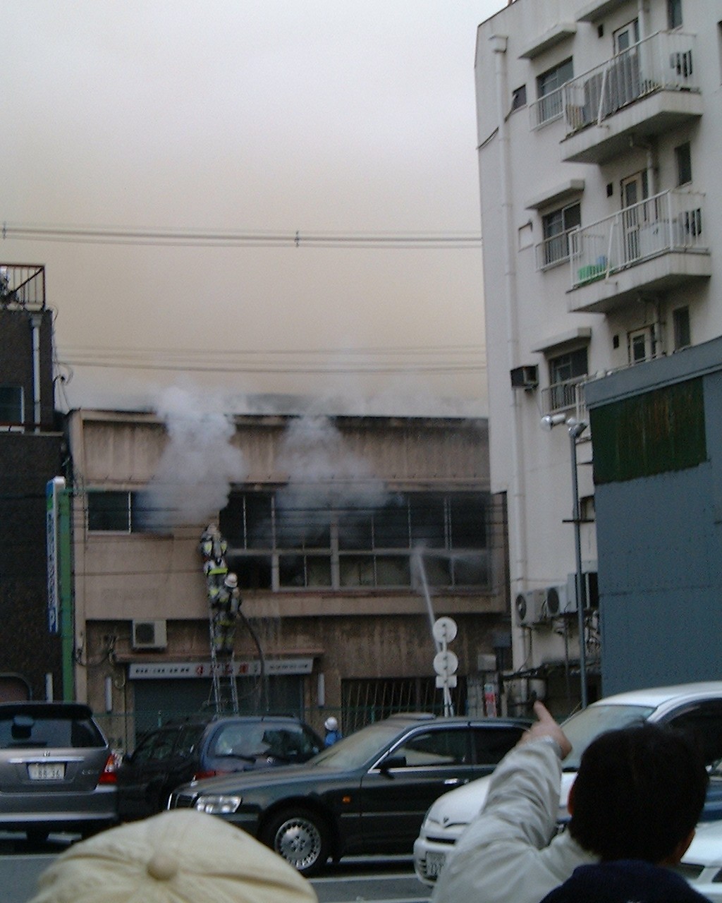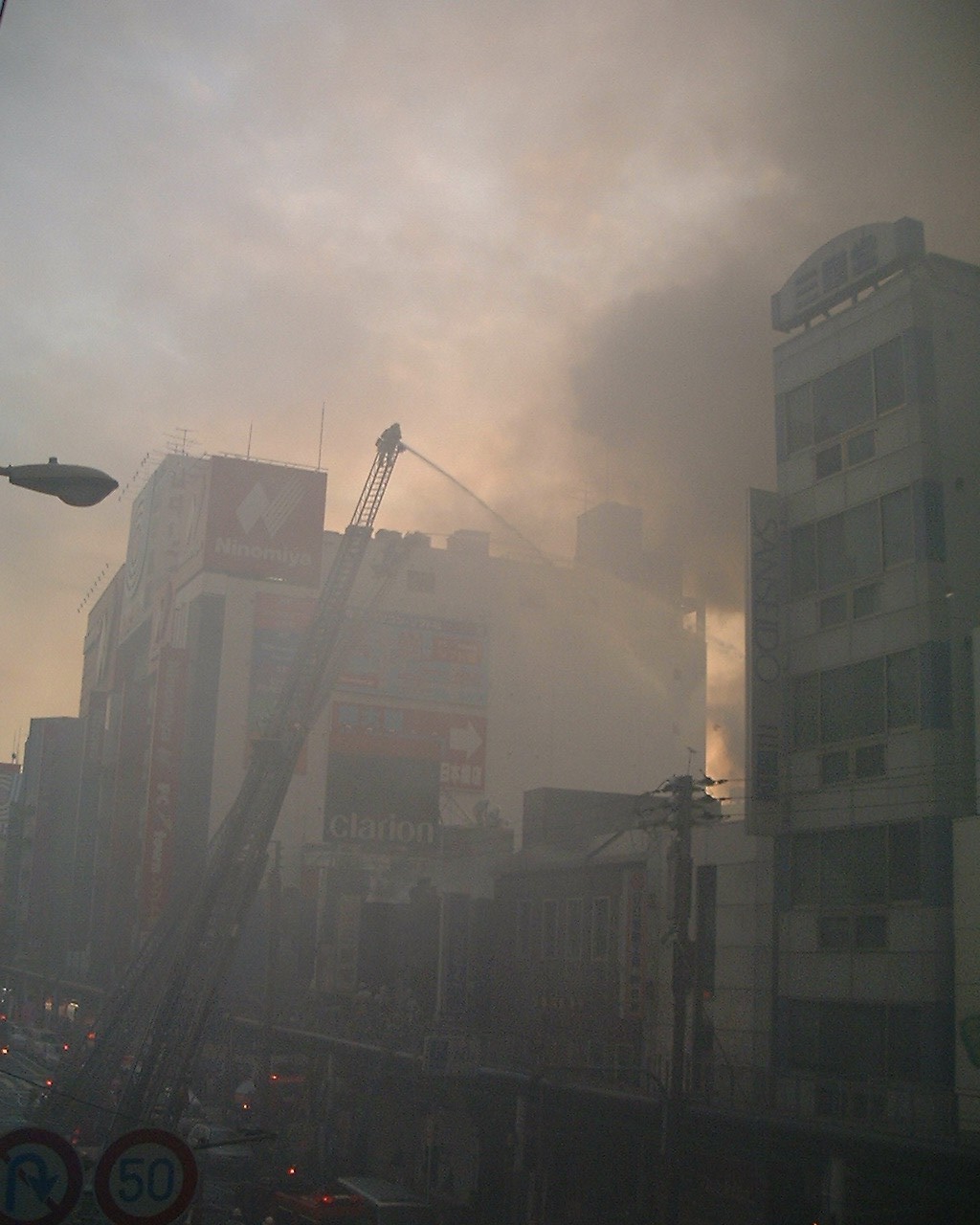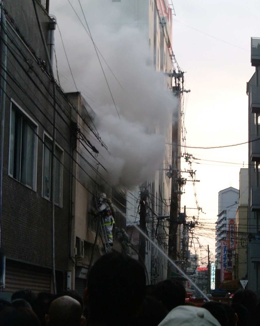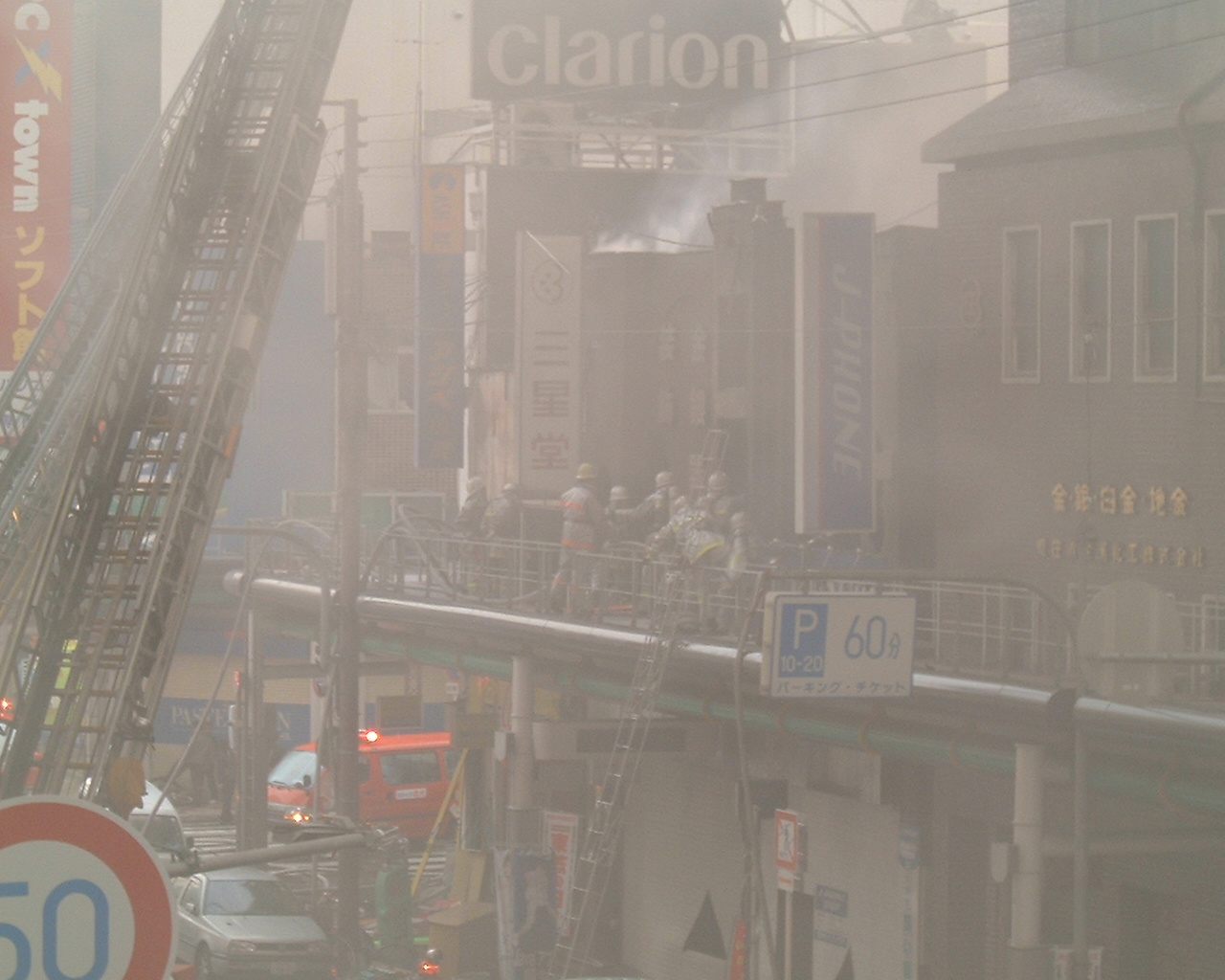歩道橋から撮影。辺り一面、ものすごい煙に包まれて、かなり写りが悪い。 撮影していると目が痛くなってきた。3枚目の写真はアーケードの上で、 消防士が窓をハンマーで壊しているように見えた。