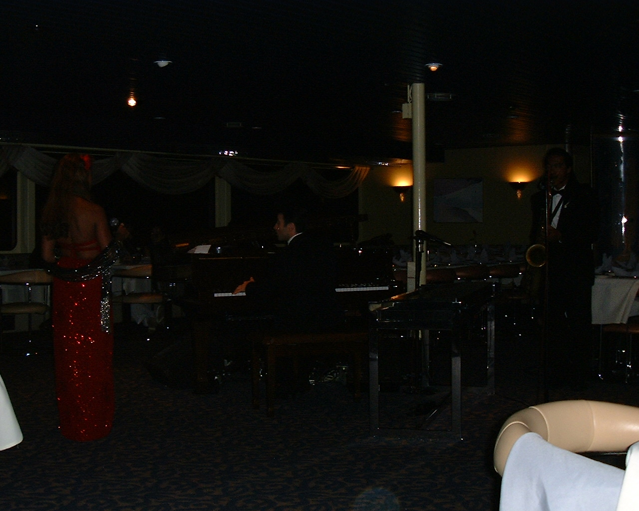 ちょっと写りが悪いけど、ジャズの生演奏なんかもある。 さらに、Pちゃんが今日誕生日だったので、 ハッピバースデーを演奏してくれたり、 デザートのデコレーションのサービスなんかもあった。