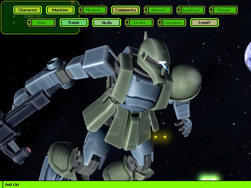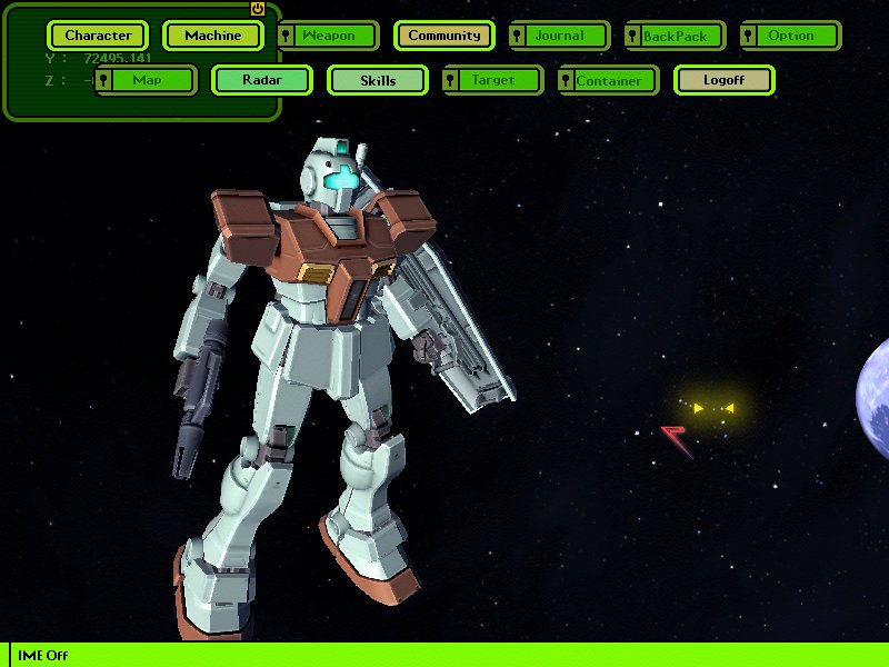 宇宙空間でいきなり戦闘という非常にアルファ2.1版という感じ。 自機以外のポリゴンは非常に少ないので、動きは非常になめらかである。 とりあえず、宇宙空間を移動する操作方法が慣れないので、非常に遊びづらいな。
