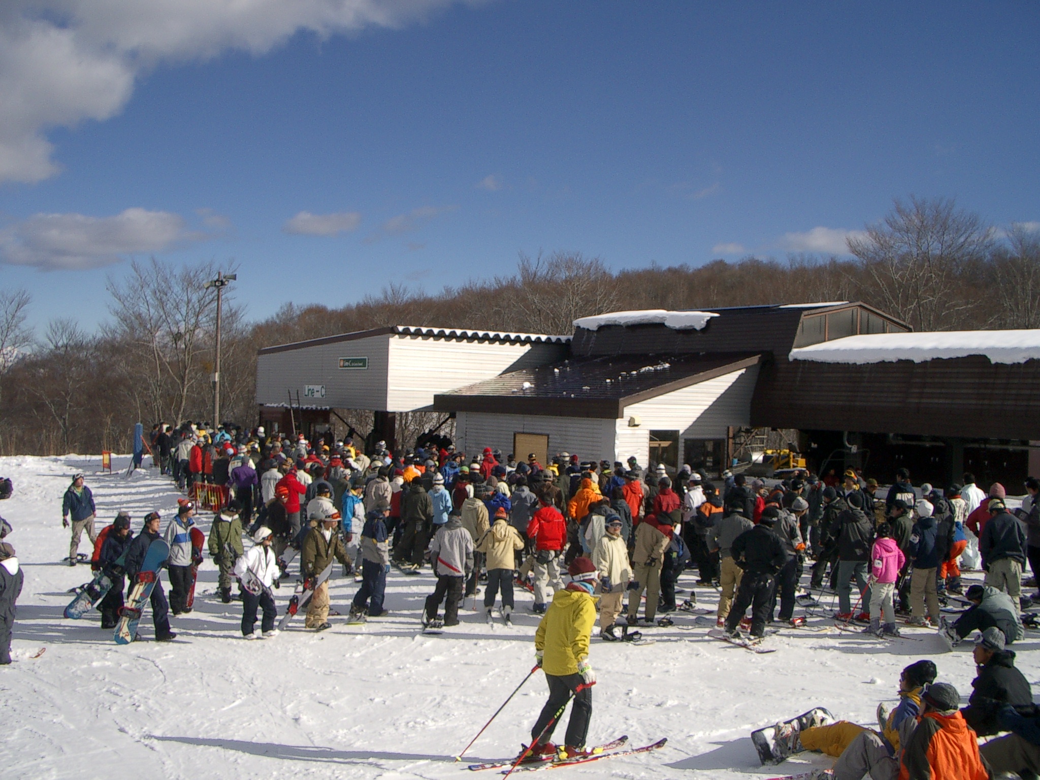 近くのスキー場ではまだオープンしていないところが多いし、ここも一部のゲレンデだけのオープンなので、 物理的に滑れるところが少ない。というわけで、そこに人が集中してしまってリフトが混んでる。 リフトで10分以上待つのなんて何年ぶりだろうか。いや、昔はこれくらいが普通だったんだけどね(爺モード)。