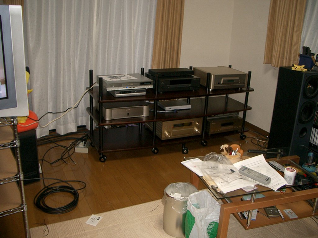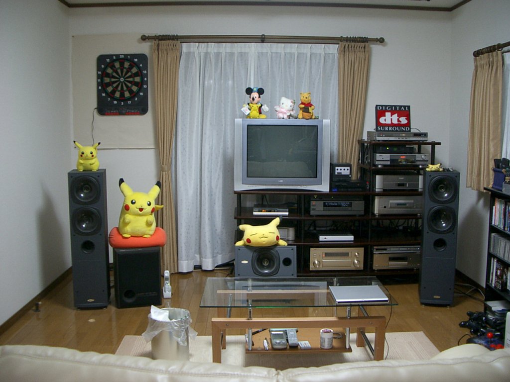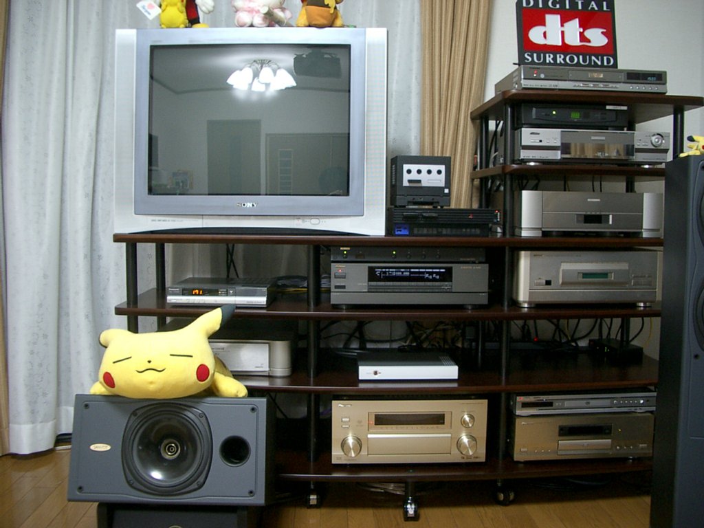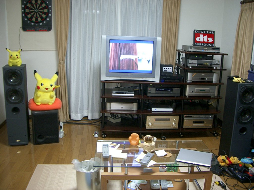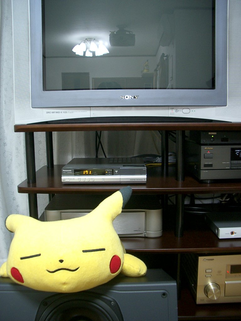 (スピーカー上のピカチュウがカメラ目線なのは気のせいだ) 50kgの29インチテレビは上下移動させずに、 3mほど水平移動させただけなのでまだ楽だった。 それよりも、床置きにしている30kgのAVラックを移動させる方が疲れるな。