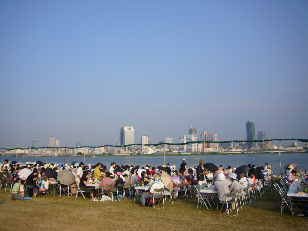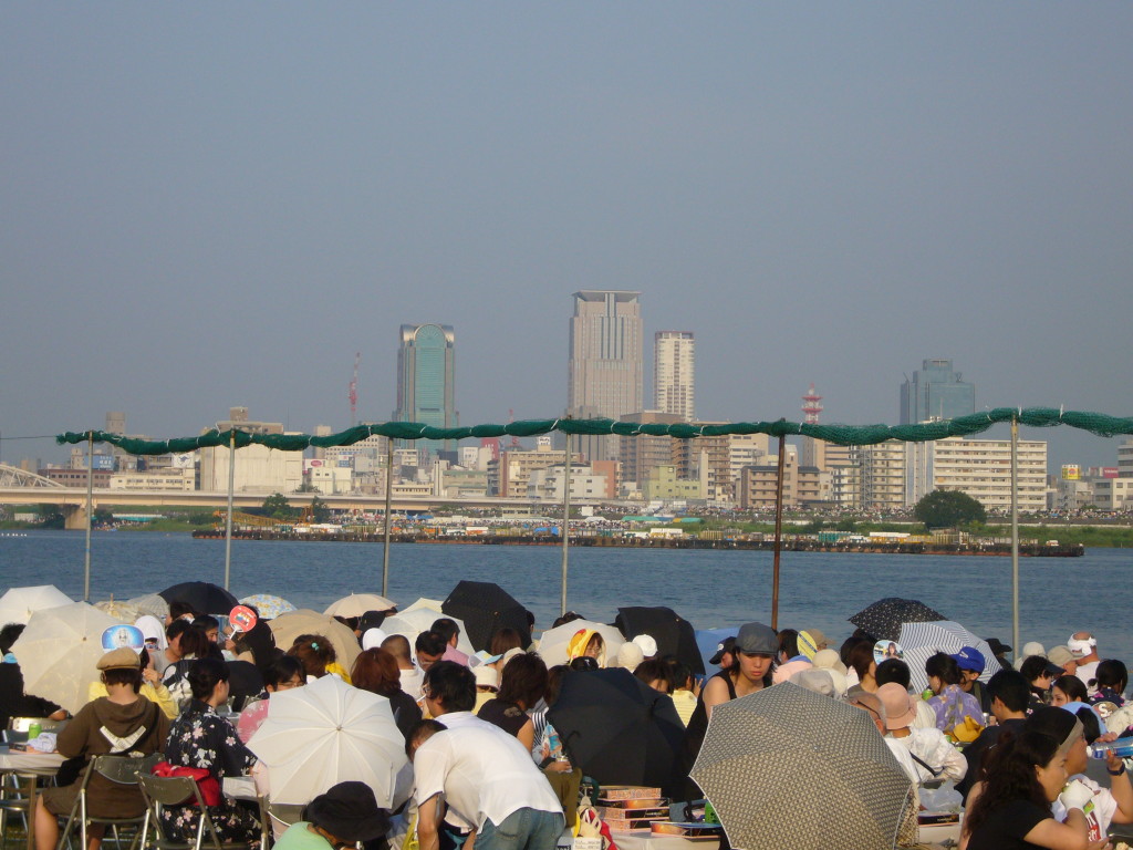 淀川花火大会の十三会場に到着。今年は有料席で観戦。
