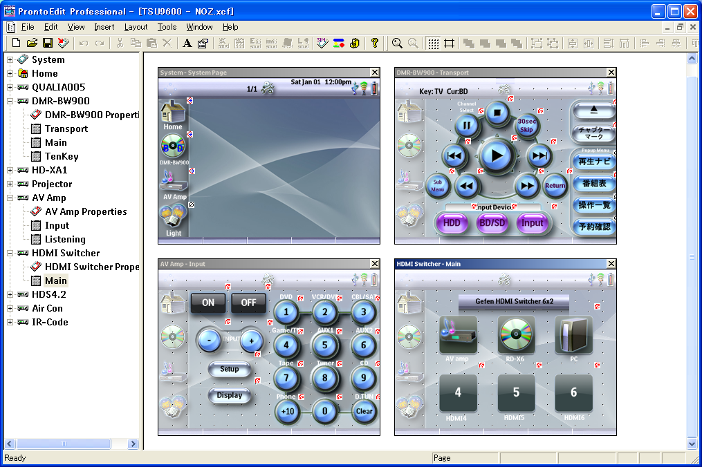 一つ一つボタンを配置して、そのActionを定義する。 リモコンの信号を送る、Waitを入れる、他のページにジャンプするなどが設定できる。 一つずつ設定しないといけないので面倒ではあるが、非常に自由度が高い。 シミュレータ機能もあるので、PC上で動作確認をした後に、Prontoにデータを転送。