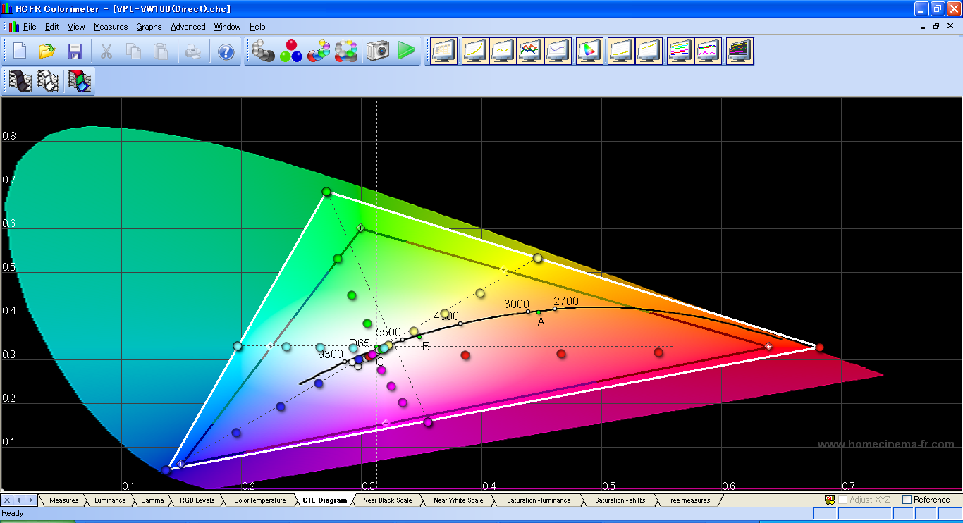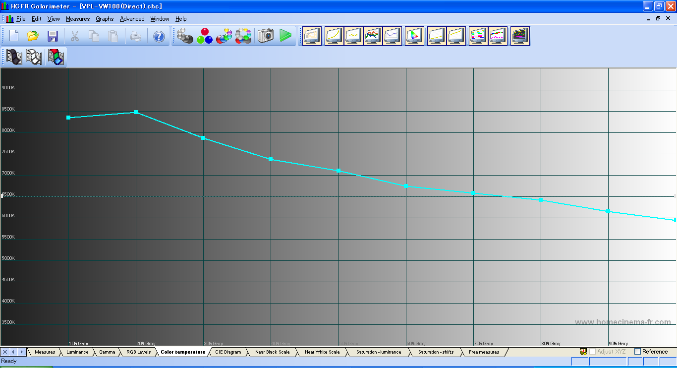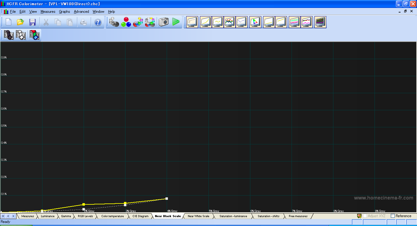 つぎはVPL-VW100の結果。 センサーをスクリーンに向けて測定しようとしたら、near blackがまったく測定できなかったので、 センサーをプロジェクタに直接向けて測定した。 これでも、コントラスト比は、全白/全黒のコントラスト比は測定不可、 ANSIコントラスト比は104:1となった。 これでも全然黒の測定が出来ていない。