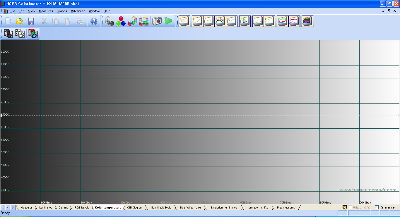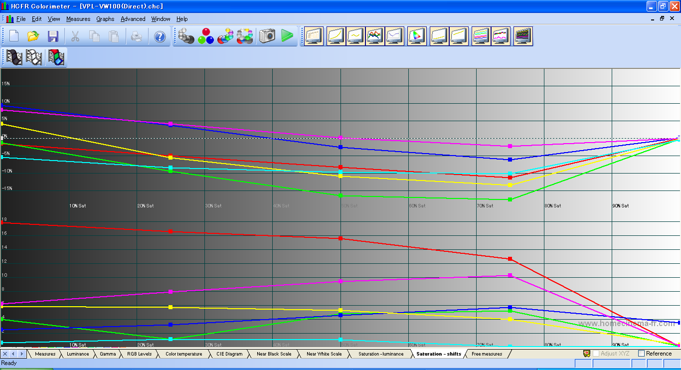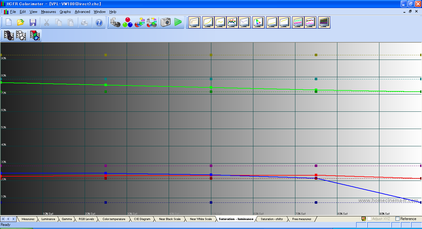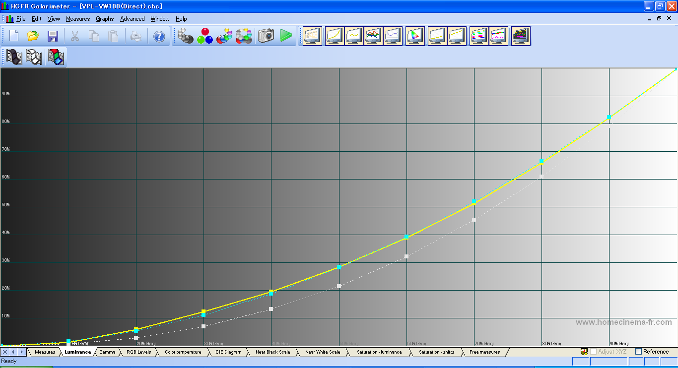 つぎはVPL-VW100の結果。 センサーをスクリーンに向けて測定しようとしたら、near blackがまったく測定できなかったので、 センサーをプロジェクタに直接向けて測定した。 これでも、コントラスト比は、全白/全黒のコントラスト比は測定不可、 ANSIコントラスト比は104:1となった。 これでも全然黒の測定が出来ていない。