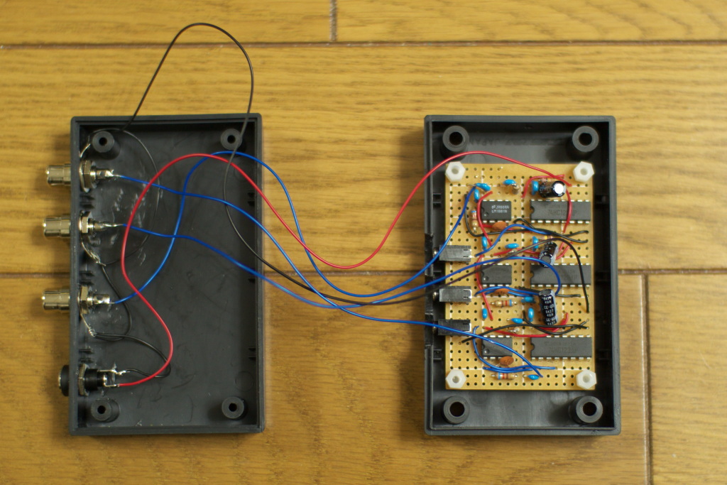 RD-X6(amazon)やRD-X5(amazon)は電源ON/OFFの独立したリモコン信号がないです。 そこで、 ここのサイトのタイマー録画用回路を 参考にして、映像信号検出回路を作ってみた。 ビデオ同期分離回路LM1881をコンポジット信号から垂直同期信号を抽出し、 マルチバイブレータ74HC123で安定して信号を出力という簡単なもの。