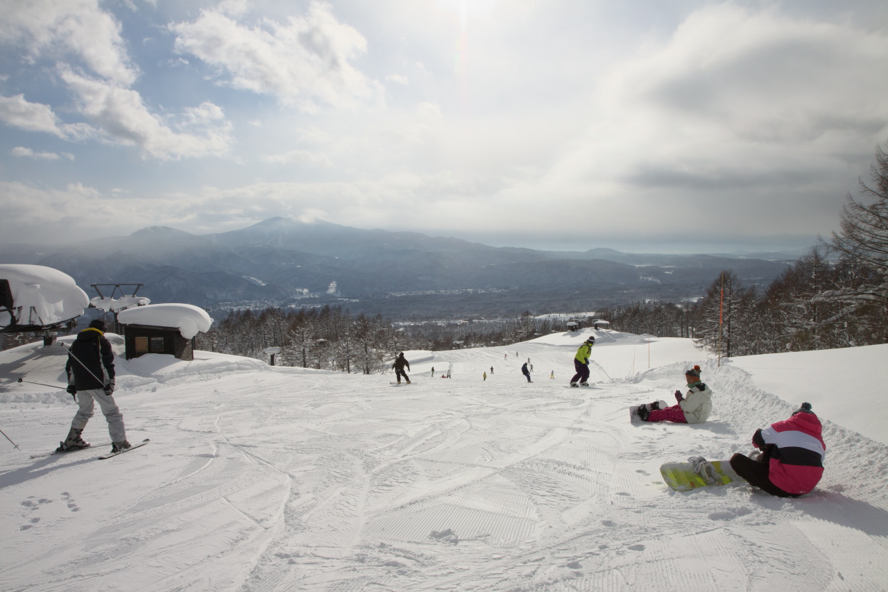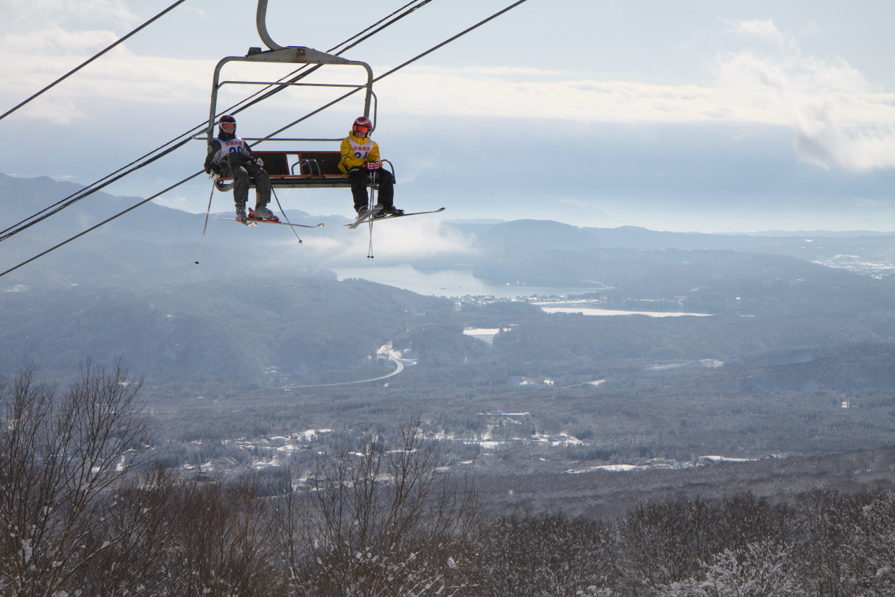 天気がいいので、野尻湖も見えている。 昨日よりも気温も上がってきたせいでか、、ちょっと雪が重くなってきた。 決して、体が重いわけではない。