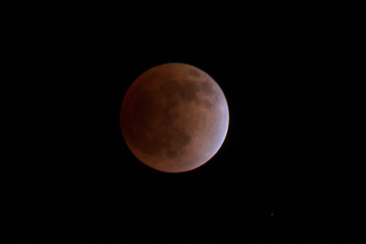 始めは曇っていたが、雲の隙間が出来てきたので皆既月食を見てみた。