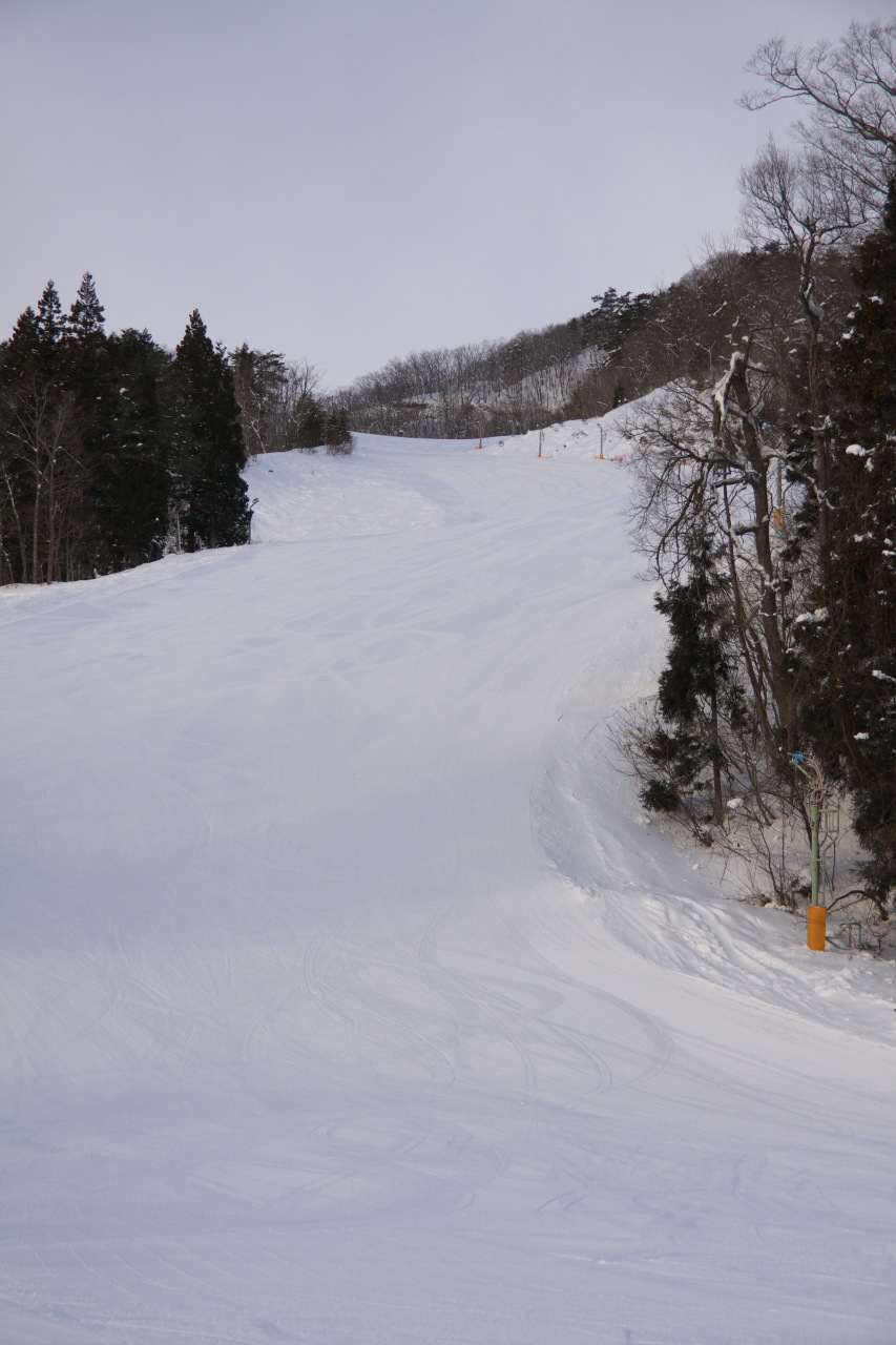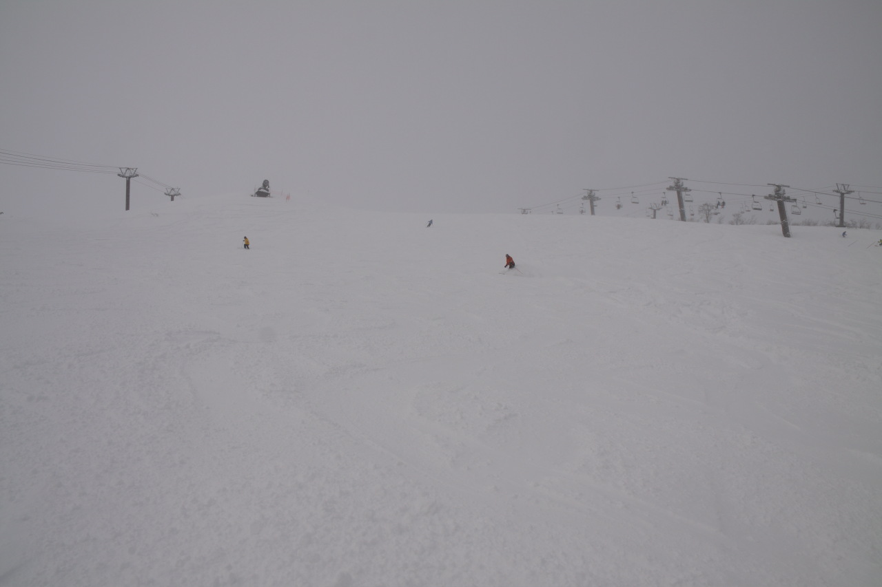今日はかなり気温が低めで吹雪いているが、雪質はかなりいい。 上の方は風が強いこともあって、動いていないようだ。