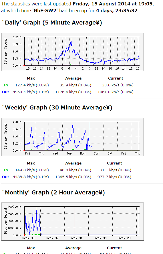 FMP-X10のダウンロード速度をMRTGグラフ化してみた。 平均1.5Mbpsくらいしか出ていない。 映画1本で50GBくらいあるので、全然終わらない。