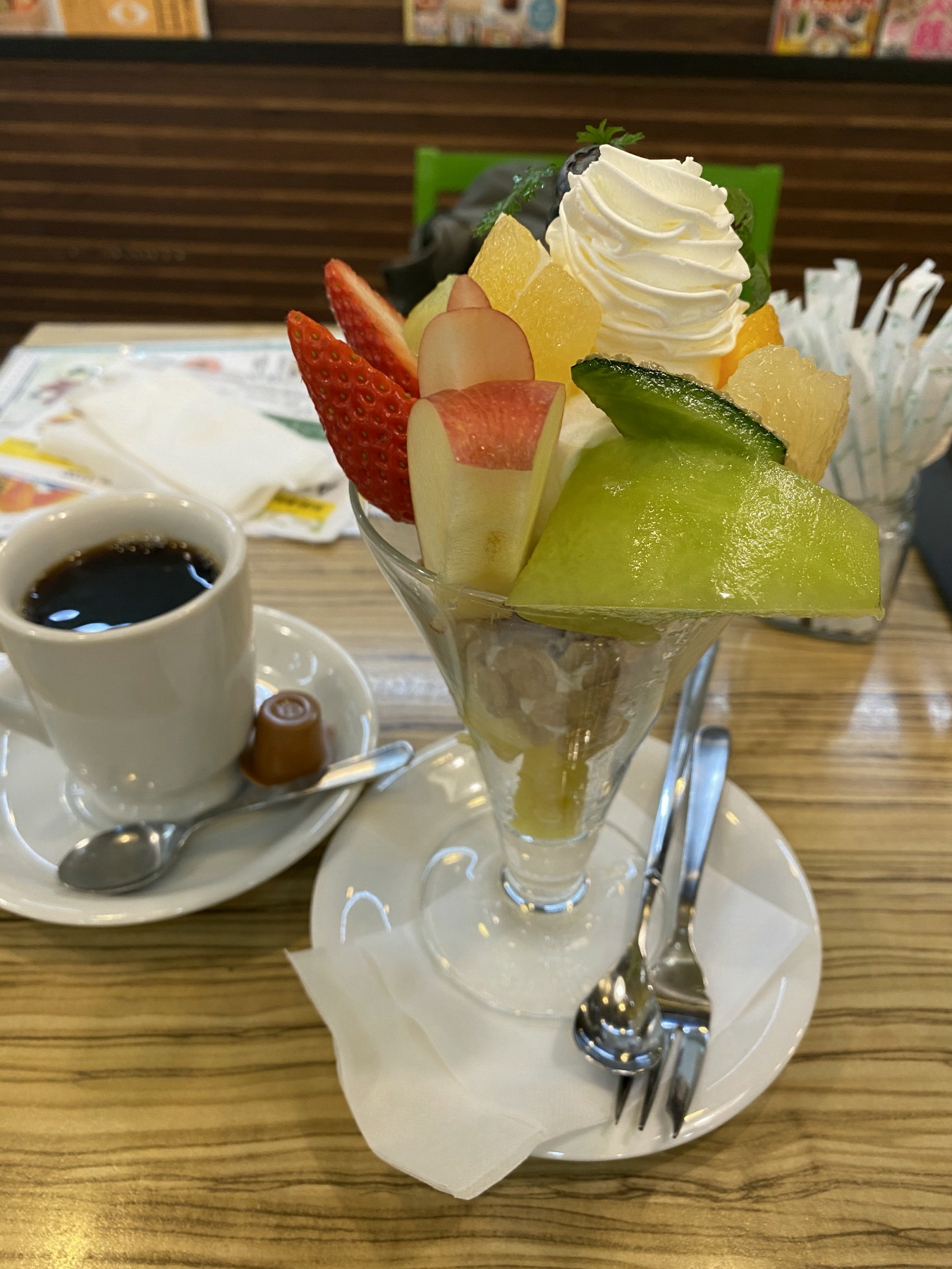 無事に6ミッションが終わったので、「ヤオカネ」でフルーツパフェでご褒美。